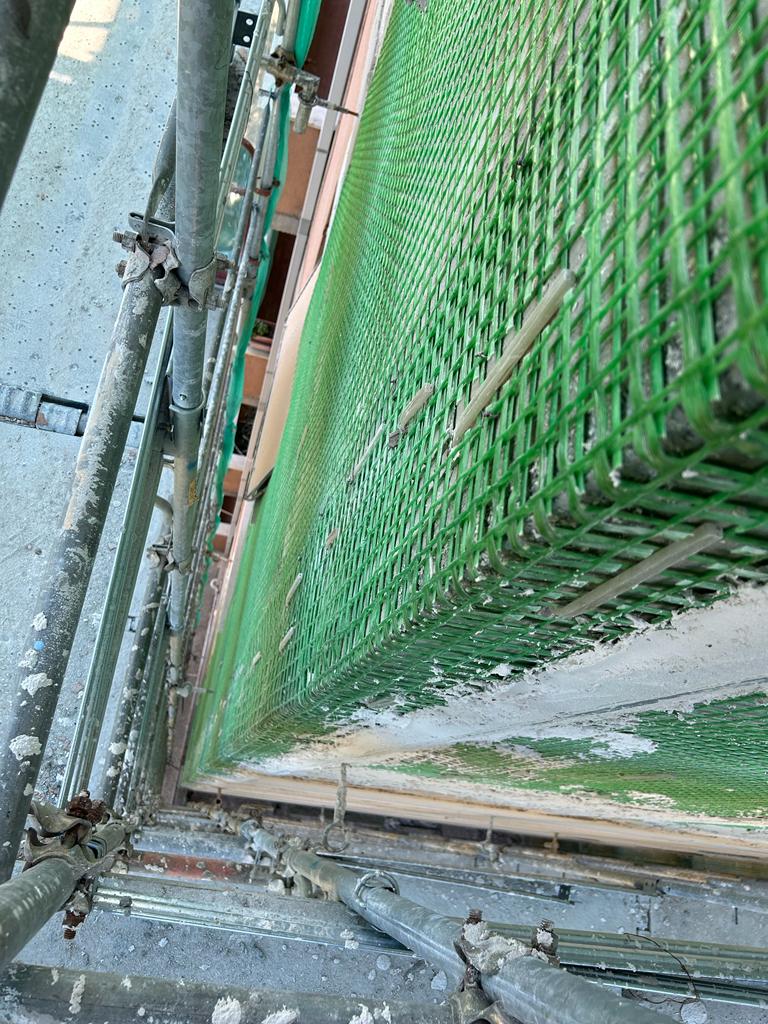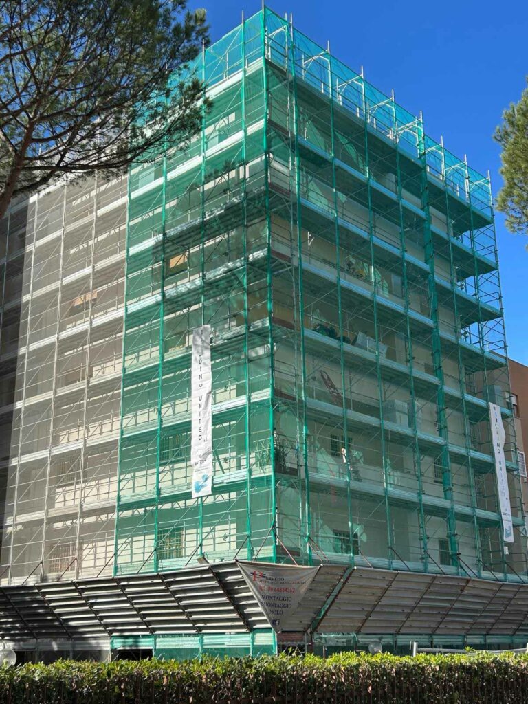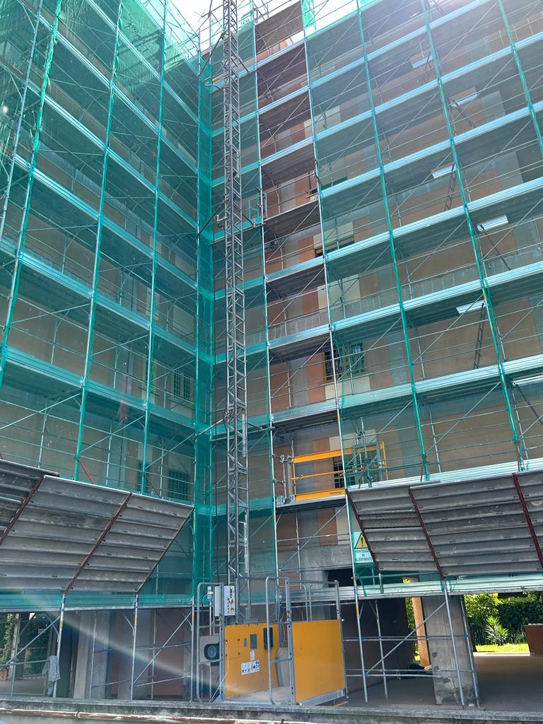 Interventi strutturali mediante la realizzazione di intonaco armato su tutti i prospetti, risanamento strutturale dei pilastri del piano piloti e del piano interrato.